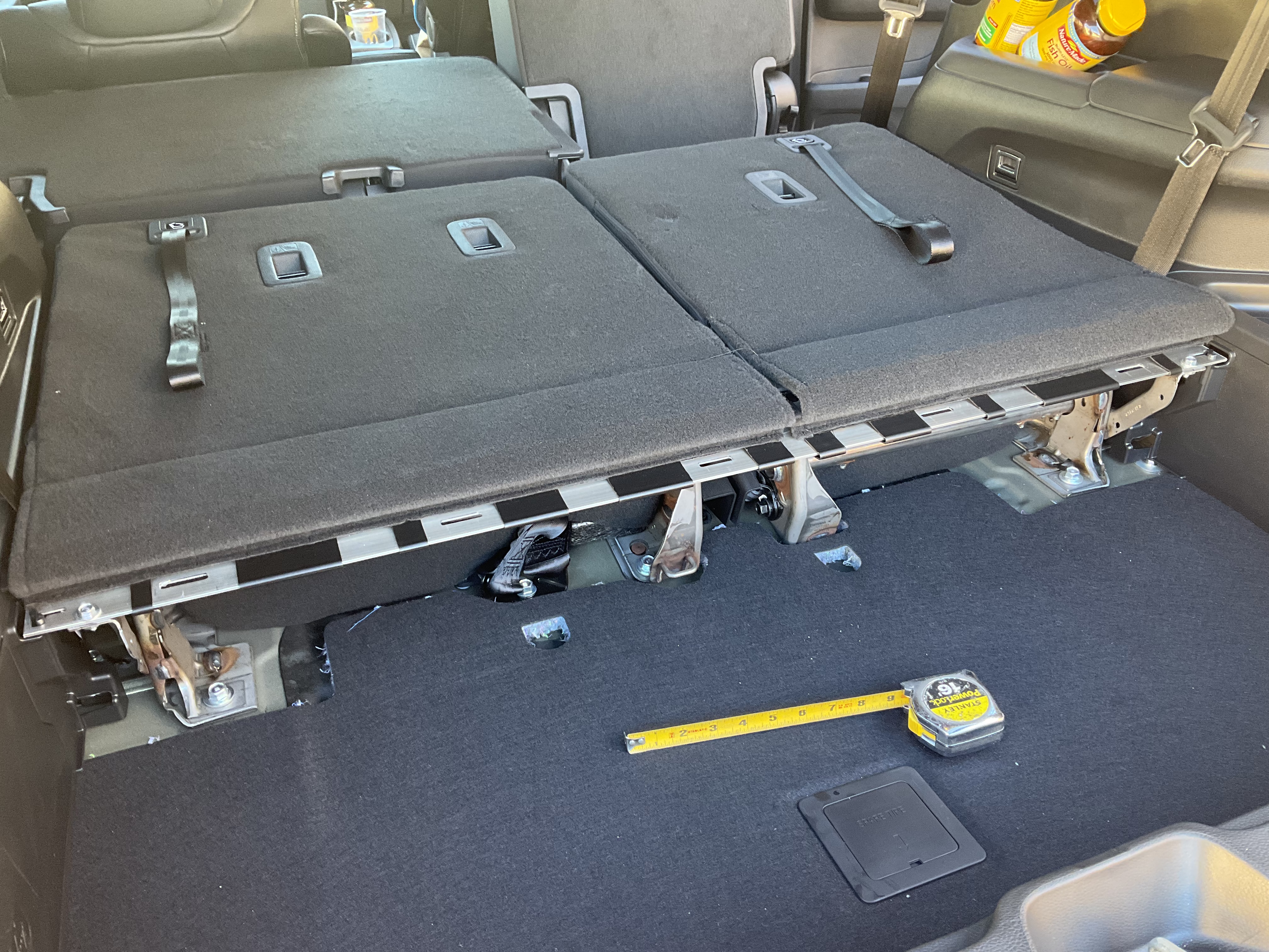 By removing the rear seats the sub-floor is lowered 8”. A new, lowered, flat hardwood floor is fabricated and allows for the fitment of a full-size memory foam mattress to support a good night’s sleep! With the mattress removed, the new hardwood floor allows full ceiling-to-floor cargo space that is greatly improved over a stock vehicle. Heating and cooling ductwork is integrated into the floor.